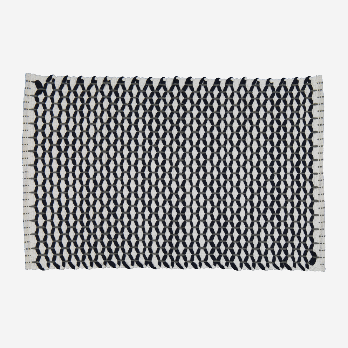 Previous Product Next ProductCreate a base of warmth in your home with this beautiful handwoven 100% cotton rug in white with a contrasting Navy "Lattice". Size: 60 x 90 cm Material: 100% Cotton